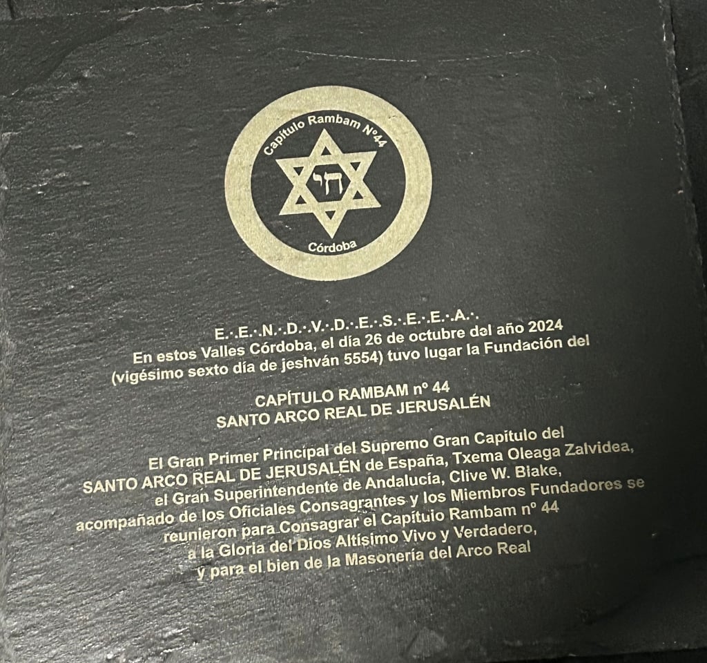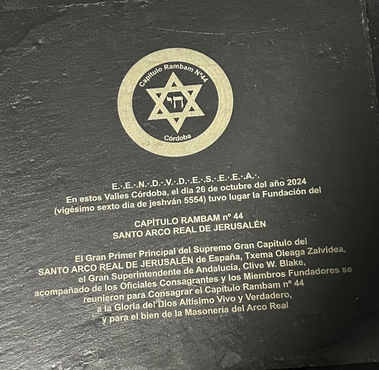 The Grand First Principal of the Supreme Grand Chapter of the HOLY ROYAL ARCH OF JERUSALEM of Spain. Txema Oleaga Zalvidea, the Grand Superintendent of Andalusia, Clive W Blake, accompanied by the Consecrating Officers and Founding Members, gathered to consecrate Chapter Rambam No. 44 to the Glory of the True and Living God Most High, and for the good of Royal Arch Masonry.
